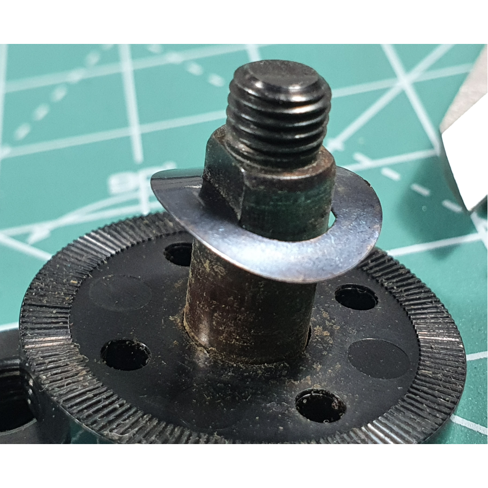 This is a special slotted wave spring washer that fits onto the shaft after the rotary blade, it is locked into position with a hand tight thumb nut,